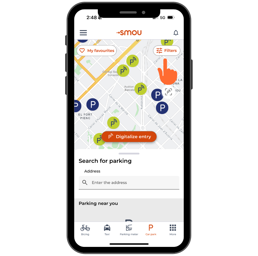 When looking for parking in Barcelona with SMOU, use the smart filtres to choose your vehicle type (car or motorbike) in the 'Parking' menu. Car parks where you can pay with the app will appear in pistachio green.