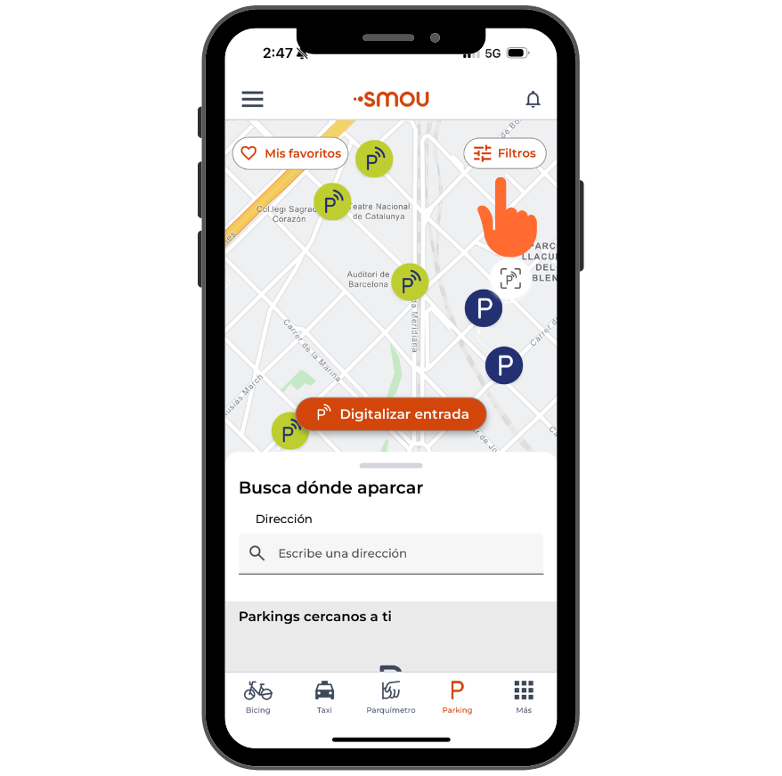 A la hora de buscar estacionamiento en Barcelona con SMOU, utiliza los filtros inteligentes para seleccionar la tipología de vehículo (coche o moto) en el menú "Parking". Te aparecerán los aparcamientos donde puedes pagar con la aplicación de color pistacho.