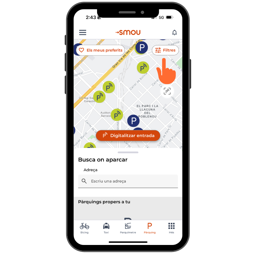A l'hora de buscar estacionament a Barcelona amb l'SMOU, utilitza els filtres intel·ligents per seleccionar el tipus de vehicle (cotxe o moto) dins el menú "Pàrquing". T'apareixeran els aparcaments on pots pagar amb l'app de color festuc.