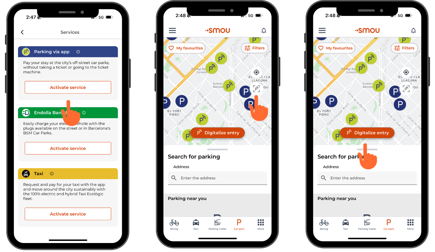 When looking for parking in Barcelona with SMOU, use the smart filtres to choose your vehicle type (car or motorbike) in the 'Parking' menu. Car parks where you can pay with the app will appear in pistachio green.