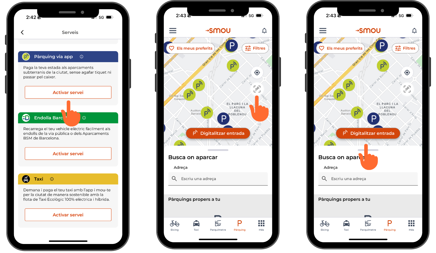 El servei 'Pàrquing via app' et permet pagar el pàrquing amb el mòbil. Aparca amb SMOU i paga les teves estades per minuts sense agafar tiquet. A més, accediràs a l'aparcament amb l'Entrada Express per lectura de matrícula.